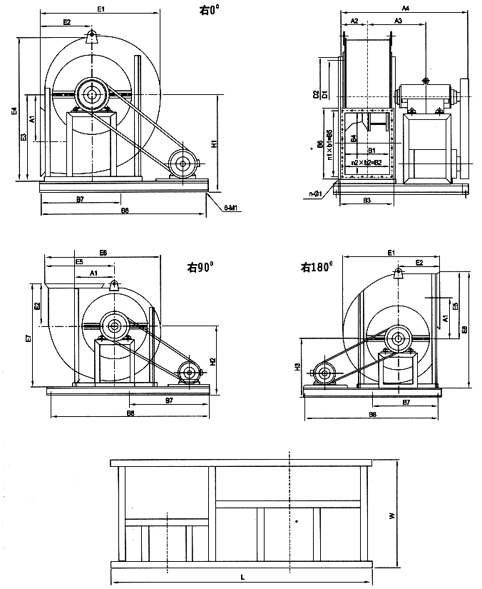 風(fēng)機(jī)分左旋和右旋兩種型式,從電機(jī)(皮帶輪)側(cè)正視,葉輪按順時(shí)針方向旋轉(zhuǎn)為右旋,逆時(shí)針旋轉(zhuǎn)為左旋。A式為電機(jī)直聯(lián)傳動(dòng), B、C、E式為皮帶傳動(dòng),D、F式為聯(lián)軸器傳動(dòng)。